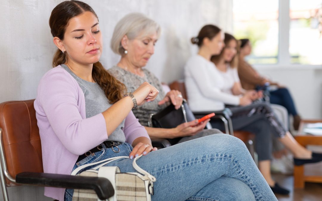 Young girl looking at watch while sitting in lobby of clinic